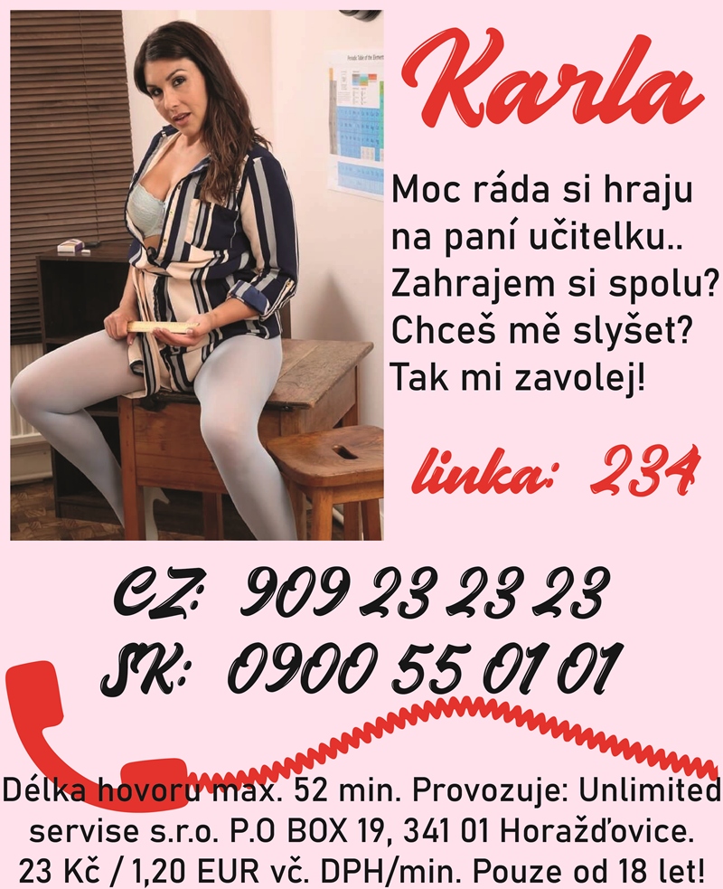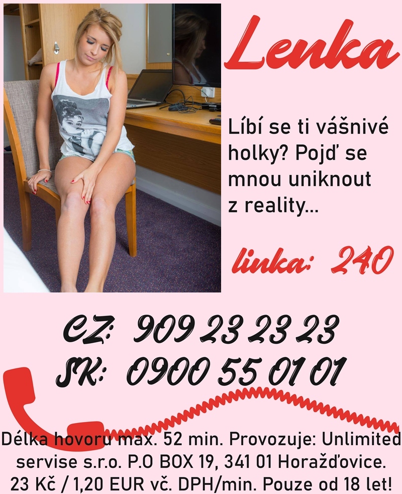 Vyber si jednu z nás, zavolej nám, zvol vybraný kód a nech se unášet na vlnách fantazie. S námi zažiješ skvělé chvilky, kterými tě rády provedeme. Jsme tady pro tebe NONSTOP 24 hodin denně! Jsme holky bez závazků, čekáme na tvůj telefonát pěkně doma v soukromí, rády si s tebou popovídáme o čemkoliv, máme rády romantiku i pikantní příběhy. Jen ale nezapomeň, že nejsme seznamka a musí ti být více jak 18 let!